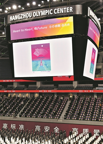4月1日,杭州2022年亚运会官方海报在杭州奥体中心体育馆的大屏幕上展示。当日,浙江省杭州市召开誓师动员大会,吹响亚运筹办“决胜攻坚”的号角,推动全市工作重心全面转入亚运筹办工作。新华社记者 黄宗治 摄