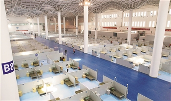 4月6日,海南国际会展中心内的海口方舱医院建设工作加紧推进,建成后可提供约2000张床位,配套建设可供485名医务人员和320名后勤保障人员使用的工作和生活系统。新华社记者 杨冠宇 摄