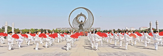 山东青州中老年健身爱好者在进行太极拳展演。王继林 摄/视觉中国