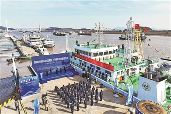 4月6日,浙江省海洋生态环境监测中心在舟山举行“中国环监浙001”船入编仪式,这是我国首艘千吨级近海生态环境监测船,也是我国同类环监船中速度最快的海洋生态环监船之一。据介绍,该船长63.91米,型宽10.60米,设计航速13.5节,续航能力2800海里。本报通讯员 姚峰 摄