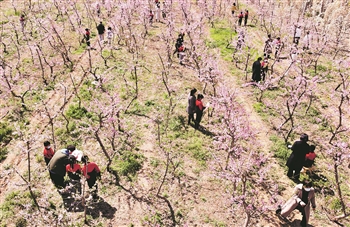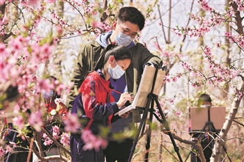 4月7日,河北省邢台市广宗县件只乡东张魏小学美术老师在桃园中指导学生写生。该校依托校门口的花海田园,开设了涉足语文、科学、音乐、美术等各项课程实景课堂,让学生零距离感受美好春光。王垒 摄/人民图片