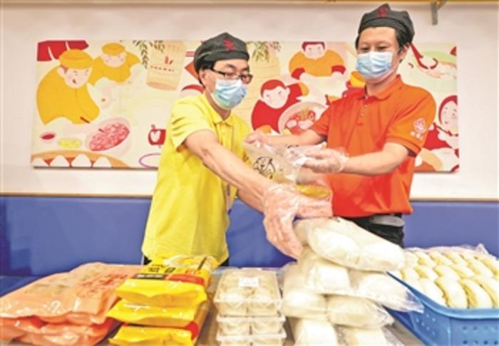 图为4月10日,上海老盛昌徐江区梅陇路店员工黄庆(右)、任海在恢复营业的店内为网上订单打包。
