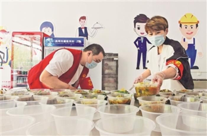4月7日,在河北省邯郸市永年区临洺关镇,“80后”夫妻正在为抗疫一线工作人员分装“爱心餐”。近期,面对疫情防控形势,胡永旗经营的一家快餐店暂停营业,他与妻子王亚楠主动为一线抗疫人员免费送餐。每天,他们都会和临洺关镇辖区的分包单位沟通,根据一线需要进行配餐。 胡高雷 摄/人民视觉