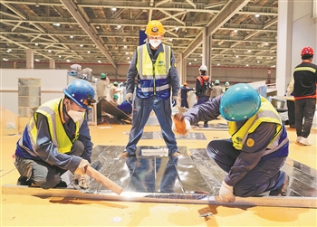 4月11日凌晨,在国家会展中心(上海)方舱医院中尚未交付的部分区域,工人正加紧推进建设。“四叶草”正与时间赛跑,争分夺秒改建成上海重要的方舱医院。9日,国家会展中心(上海)3号馆改建工程完工交付,医疗队第一时间入驻并接收患者。