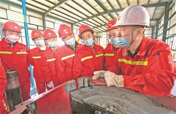 4月12日,中国石油西部钻探准东钻井公司兼职培训师霍卫兵(右)正在为钻井队员进行操作培训。该公司利用专家、工程师、专兼职培训师和骨干力量,开展线下线上“大培训”素质提升活动,为企业高质量发展锻造高素质人才队伍。本报通讯员 周建玲 摄