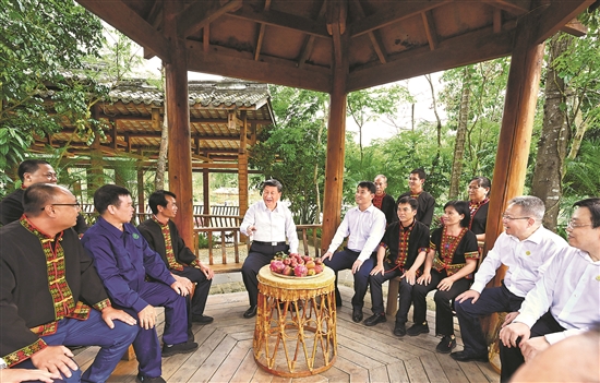 4月10日至13日,中共中央总书记、国家主席、中央军委主席习近平在海南考察。这是11日下午,习近平在五指山市水满乡毛纳村,同当地干部群众亲切交谈。 新华社记者 李学仁 摄