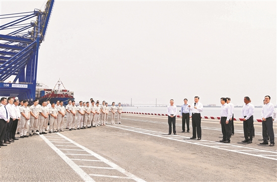随后,习近平来到洋浦国际集装箱码头小铲滩港区,了解港口建设发展情况,同现场作业人员、挂职干部代表等亲切交流。习近平强调,振兴港口、发展运输业,要把握好定位,增强适配性,坚持绿色发展、生态优先,推动港口发展同洋浦经济开发区、自由贸易港建设相得益彰、互促共进,更好服务建设西部陆海新通道、共建“一带一路”。他指出,党中央选派干部来自由贸易港挂职,既体现了党中央对自由贸易港建设的关心和支持,也是对干部的培养锻炼,要发挥挂职干部的积极作用,让他们在基层一线增长才干。