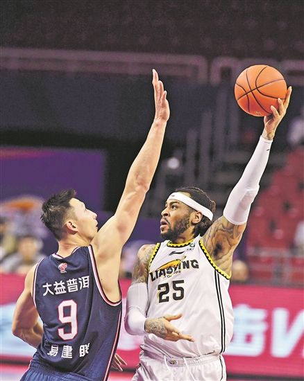 4月12日,辽宁本钢队球员莫兰德(右)在广东东莞大益队球员易建联的防守下投篮。当日,在江西南昌举行的2021-2022赛季中国男子篮球职业联赛(CBA)季后赛半决赛中,辽宁本钢队以92比79战胜广东东莞大益队,以总比分1比0暂时领先。新华社记者 彭昭之 摄