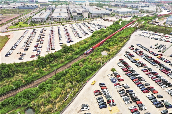 4月14日,长城汽车专列首发列车行驶在重庆永川国家高新区铁路专用线上(无人机照片)。据了解,该铁路专用线位于重庆永川国家高新区凤凰湖产业园,地处成渝铁路栏杆滩站处,于2020年11月动工,2022年4月14日首运通车。该线的顺利投用将有效解决园区企业物流成本高、运输效率低等问题。新华社记者 唐奕 摄
