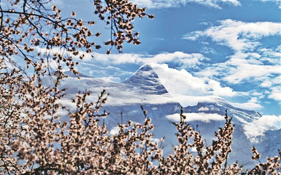 桃花掩映下的南迦巴瓦峰(4月13日摄)。
