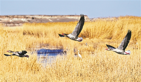 近日,随着天气转暖,位于内蒙古阿拉善盟额济纳旗的居延海湿地迎来大批候鸟。随着居延海水域面积的逐步稳定,从这里迁徙过境的候鸟种类和数量不断增加。新华社记者 连振 摄