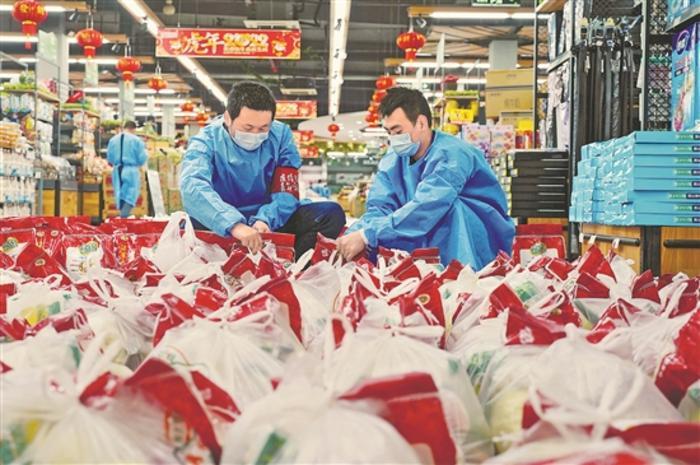 同时,上海部分超市卖场推出米面粮油、蔬菜瓜果、洗护用品等多种家庭保供套餐,与街镇居委会对接或者通过企业APP采集社区居民需求订单,然后由门店分拣配货,通过第三方物流公司配送到社区。