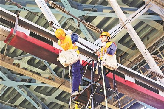 4月11日,在京沪铁路南京长江大桥上,中铁电气化局运管公司上海维管处南京维管段的接触网工们像往常一样,对大桥要害部位的接触网关键设备“把脉诊疗”。