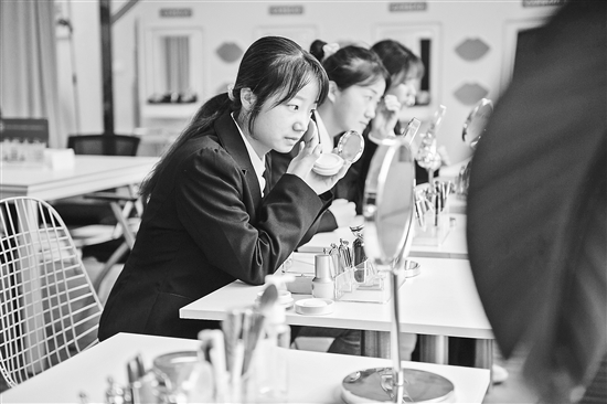 4月14日,在湖南长沙中南大学就业指导中心,学生在面试前化妆。
