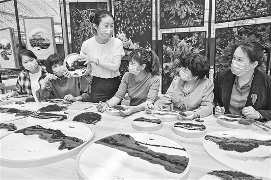 4月13日,村民在景宁县毛垟乡苔藓文化园学习苔藓画制作技术。