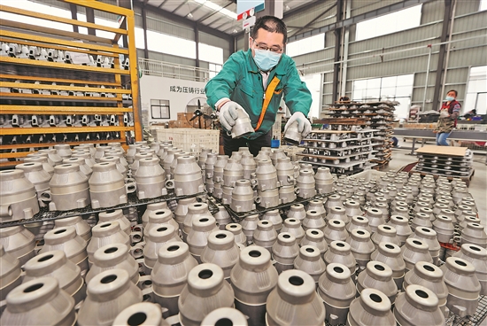 4月18日,工人在安徽全椒经济开发区一铝业企业生产配件。