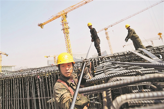 4月19日,北京城市副中心三大建筑共享配套设施2标段项目施工现场,来自中铁十五局的工人正在绑扎顶板钢筋,等待混凝土浇筑。