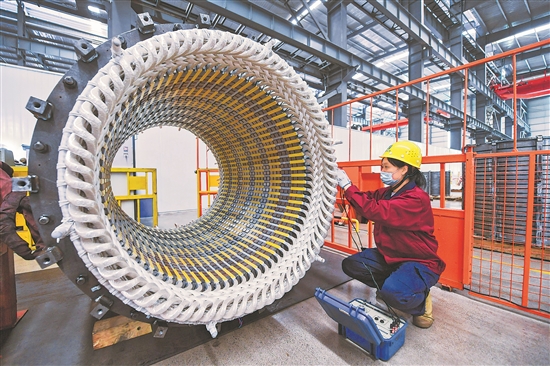 4月20日,在杭州新恒力电机制造有限公司车间内,工人在对电机进行耐压试验。