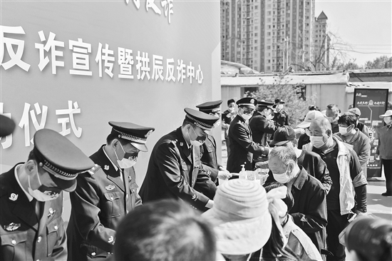 4月19日,全国首家街乡级反诈中心——北京市房山区街乡防范电信网络诈骗犯罪预警劝阻中心在北京市房山区拱辰街道正式启动。当天,公安机关向群众发放了反诈宣传品,民警代表向群众进行了防范电信网络诈骗犯罪知识主题宣讲。苏兴博 摄