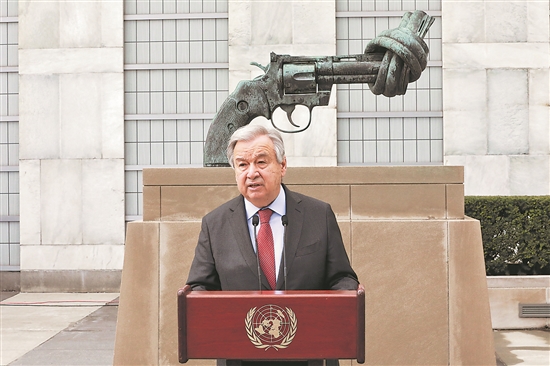 4月19日,联合国秘书长古特雷斯在纽约联合国总部标志性雕塑“打结的手枪”前对记者发表谈话。新华社记者 谢锷 摄