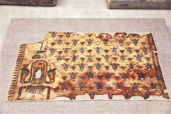 这是4月19日在位于埃及首都开罗的埃及文明博物馆纺织品馆拍摄的一件古埃及时期的纺织品。当日,埃及文明博物馆纺织品馆向公众开放。新华社发(艾哈迈德·戈马 摄)