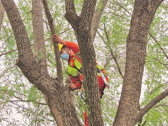 4月21日,北京通州大运河森林公园,园林绿化工人对柳树进行整形修剪。
