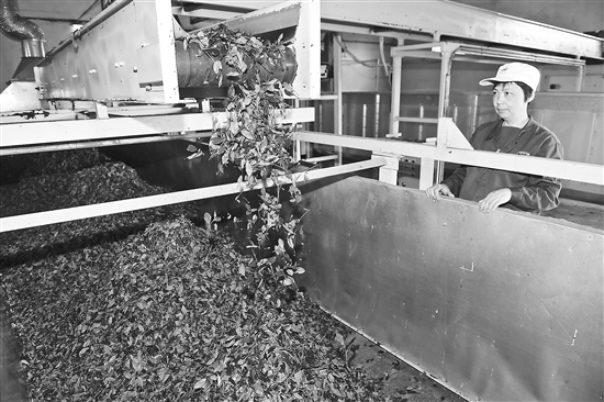4月20日,工人在现代化生产线上对鲜叶进行“贮青”制作。