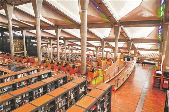 4月23日是世界读书日。这是4月19日在埃及亚历山大拍摄的亚历山大图书馆内景。该图书馆于2002年建成,不仅是图书馆,更是一个博物馆、艺术馆和综合科研机构,被誉为“埃及文化中心”“思想、文化和科学的灯塔”。新华社发(艾哈迈德·德拉兹 摄)