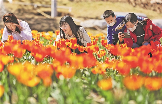图为4月16日,游客在世园公园的郁金香前拍照。本报记者 杨登峰 摄