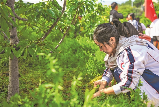 4月23日,在四川省凉山彝族自治州越西县越城镇金光村,越西县西城中学的学生们来到山间田野开展劳动实践,感受劳动带来的快乐。