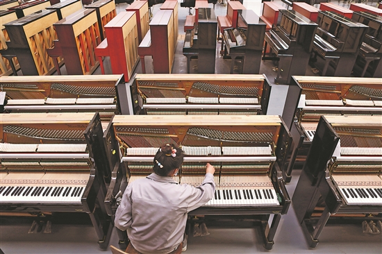 近日,辽宁省营口市重点企业行业陆续复工复产。在有70年历史的东北钢琴乐器有限公司(原东北钢琴厂)车间,钢琴调试声此起彼伏,一派繁忙。工人们在做好防疫的同时,抓紧复工生产,赶制出口欧美订单。新华社记者 王乙杰 摄