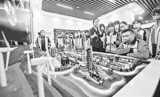 4月24日,在航天科技集团六院航天液体动力展示中心,讲解员宋柱英(中)为前来参观的西安市航天中学学生讲解。 当日是第七个“中国航天日”,主题为“航天点亮梦想”。