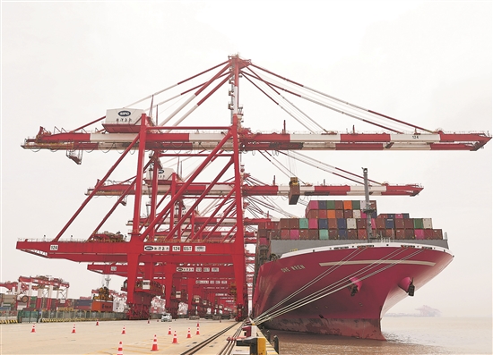 4月27日,一艘来自日本的集装箱货轮停靠在上海洋山港集装箱码头卸货。