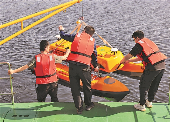 4月26日,工作人员在雄安新区白洋淀放下无人船。