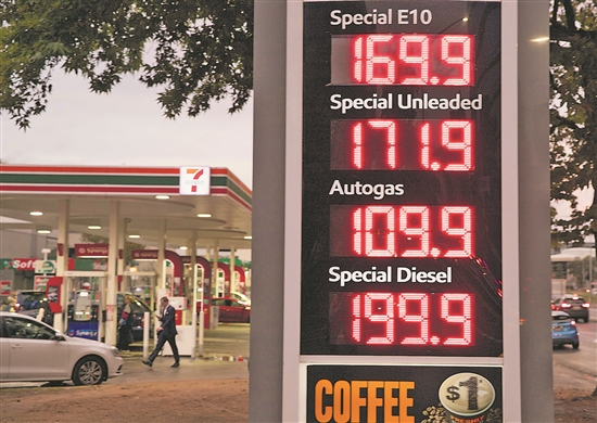 这是4月27日在澳大利亚堪培拉拍摄的加油站油价显示牌。澳大利亚统计局27日发布的数据显示,今年一季度澳消费者价格指数(CPI)同比增长5.1%,增幅创2001年以来新高。 新华社发 (刘畅畅 摄)