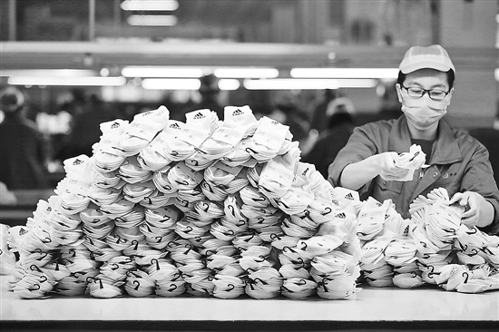 4月27日,在青岛市即墨区一家公司生产车间,制袜工人在生产出口到海外的产品。 今年以来,山东省青岛市即墨区的纺织服装生产企业订单充足,产能饱满,工人们加紧赶制海外订单,满足国际市场需求。新华社发(梁孝鹏摄)