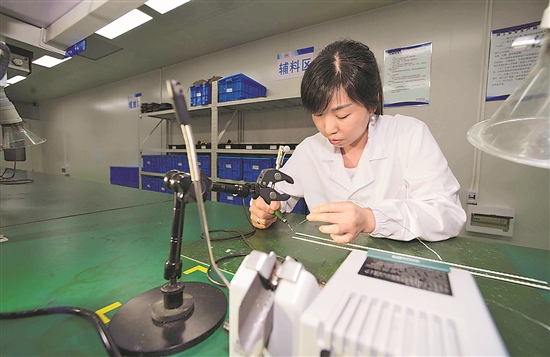 5月5日,工人在贵州省绥阳县经济技术开发区一家生产光电产品的企业焊接LED灯光条。