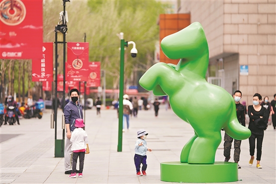 5月5日,小朋友在哈尔滨香坊区一商场门口附近摆放的“绿马”旁玩耍。