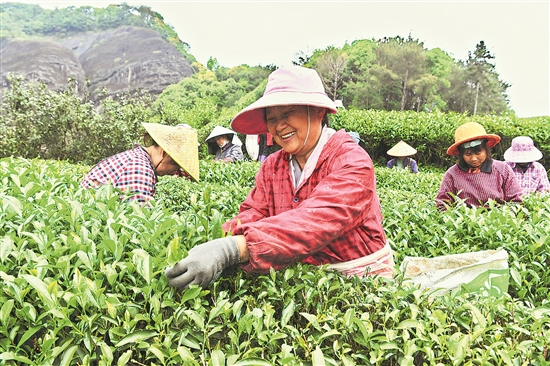 5月2日,福建省武夷山市茶农在马头岩茶园采摘茶青。眼下正是武夷岩茶的采摘旺季。当日,福建省武夷山市告别了多日的阴雨天气,当地茶农利用晴好天气抓紧采摘茶青,制作武夷岩茶。