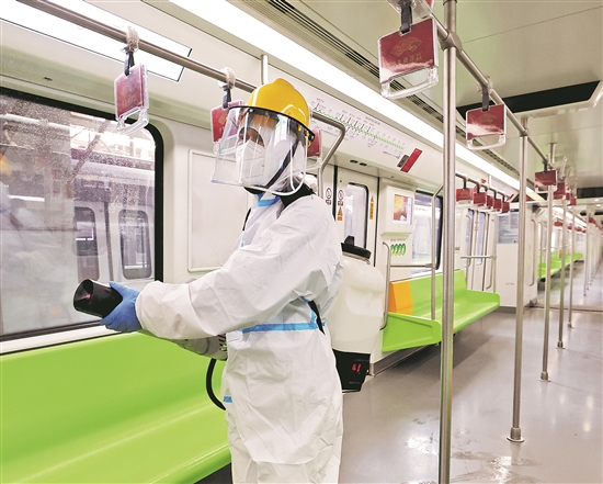 5月5日,清洁人员在上海地铁龙阳路基地对二号线地铁一车辆进行消杀。