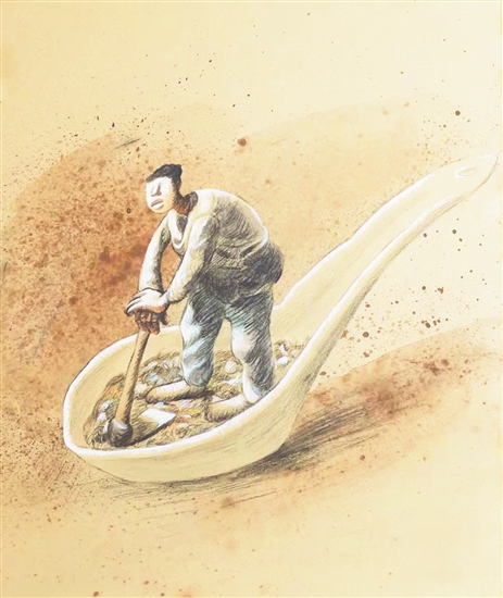 从漫画语言和技法上看,餐勺里的耕耘,属于构思范畴的“小题大做”。然而,宋晓军先生警示的问题,绝非小题大做。尽管国人的温饱问题早已得到解决,但当我们把目光投向土地和种地,看看被轻视的土地,被轻视的农耕劳动,再看看这幅漫画,就会被警笛惊醒了。