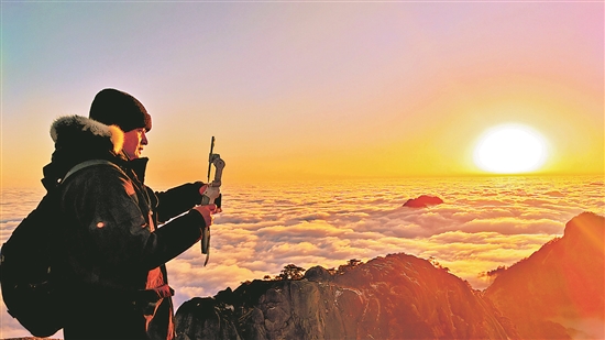 由于特殊的小气候,黄山一年当中大部分时间是云雾天气,能看到日出的机会只有80次左右。常年泡在山里,查立国基本能准确地抓住每一次日出的时机。