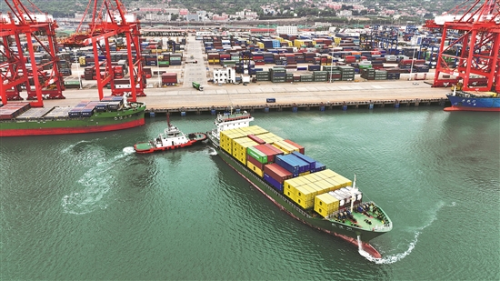图为5月9日在江苏省连云港港集装箱码头,货轮满载集装箱驶离泊位。新华社发(王春摄)