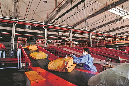 5月9日,复工复产“白名单”企业之一圆通速递浦东集运中心工作人员在流水线上扫描快递包裹。