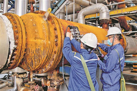 中国石化扬子石化采用超声波、三维成像仪等先进设备和技术进行检验检测,为装置平稳运行提供有力支撑。图为工人利用热成像仪对乙烯管道进行“体检”。李树鹏/摄 鲁荟宇/文