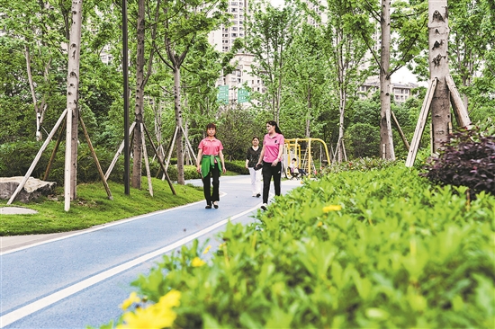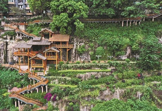 重庆市近年来结合地形地貌和历史文脉,着力用好边角地块、串连慢行系统、植入人文元素,以山城步道串连街巷、滨江、山林,并建好群众身边的社区、坡坎崖等特色公园,形成了城市新名片。上图为重庆市渝中区戴家巷崖壁步道(4月29日摄,无人机照片)。下图为居民在重庆江北区石子山社区体育文化公园散步(4月29日摄)。新华社记者 王全超 摄
