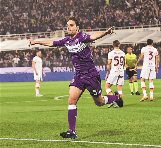 5月9日,佛罗伦萨队球员博纳文图拉进球后庆祝。当日,在2021-2022赛季意大利足球甲级联赛第36轮比赛中,佛罗伦萨队主场以2比0战胜罗马队。新华社发