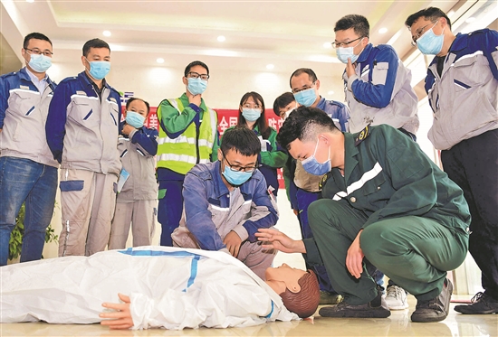5月12日,安徽省阜南县急救中心工作人员在一企业指导员工进行心肺复苏急救操作知识。当日是第14个全国“防灾减灾日”,阜南县急救中心联合县卫生健康综合执法大队组织人员走进企业,为员工讲解防溺水、中暑急救等日常实用的急救知识,提高员工的防范灾害能力。本报通讯员 吕乃明 摄