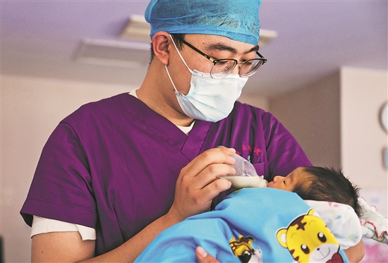 5月12日,员育国为新生儿喂奶。