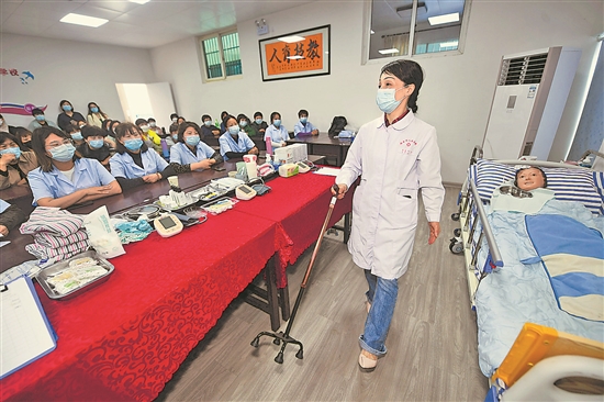 5月15日,杭州市临安区阳光职业技能培训学校的老师在示范讲解如何正确使用老人拐杖。5月份以来,临安区民政局联合阳光职业技能培训学校对护理员及党员志愿者分批次开展技能提升培训,使其掌握相关养老护理知识与技能,守护幸福“夕阳红”。新华社记者 徐昱 摄